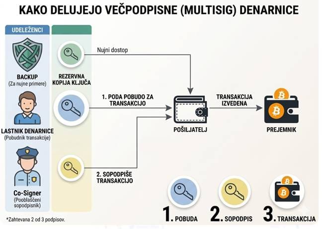 Bitcoin multisig (okrajšava za multi-signature oz. več podpisov) je varnostni mehanizem, ki zahteva več zasebnih ključev za podpis transakcije — namesto le enega. Predstavljajte si bančni sef, ki ga je mogoče odpreti le z dvema različnima ključema hkrati: noben posameznik ga ne more odpreti sam, če ne poseduje več ključev.