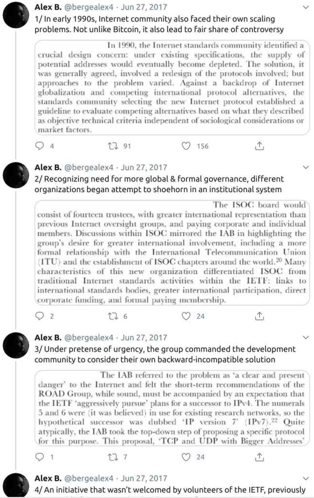 Un secondo motivo per sottolineare il confronto è quello di trarre ispirazione dalle analogie tra alcuni eventi storici che hanno riguardato la suite TCP/IP e alcune importanti pietre miliari dei primi 10 anni di Bitcoin. In particolare, la storia delle cosiddette “guerre dei protocolli” mostra sorprendenti somiglianze con il più recente dibattito sul “massimalismo Bitcoin”, mentre la storia del tentativo di acquisizione di “IPv7” riecheggia da vicino quanto accaduto intorno all’attacco NYA contro Bitcoin nel 2017. In entrambi i casi, la storia del TCP/IP può essere utilizzata come lezione sulla superiorità di standard aperti, indipendenti e convergenti. Sebbene la storia non si ripeta mai esattamente, alcune dinamiche sociali e tecniche sono spesso ricorrenti, rendendo i due episodi un’importante fonte di ispirazione.