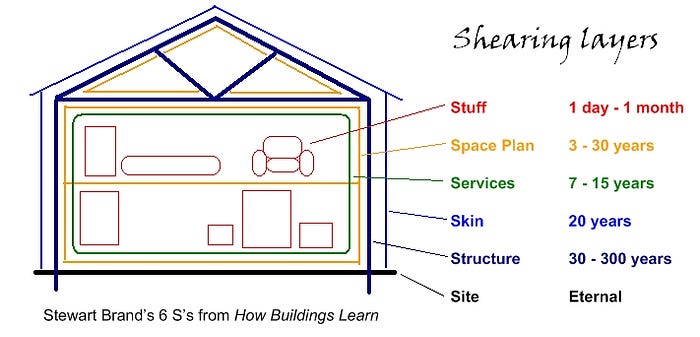 Un ottimo esempio di questa analogia, più antico di Internet stesso, si trova in architettura, dove i diversi “shearing layers” di un singolo edificio rappresentano aspetti indipendenti di esso, ognuno dei quali si evolve in tempi diversi, con diversa longevità.