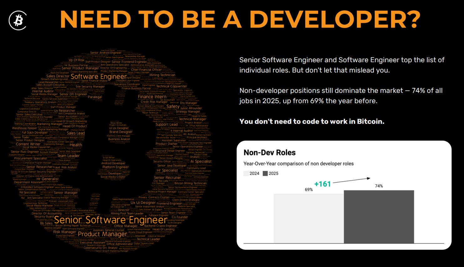 Back then, drawing from 1,707 unique listings, last ear alone showed a whopping 69% in non-developer roles. We're talking product managers, accountants, graphic designers, community builders, marketers, and more. Over 1,000 positions that could build on skills many of us already have from our non-Bitcoin jobs.