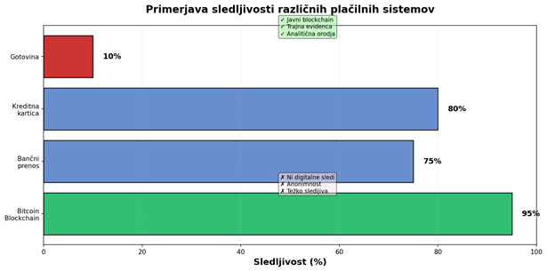 | Sledljivost | ✗ Minimalna | ✓ 100% blockchain evidenca |