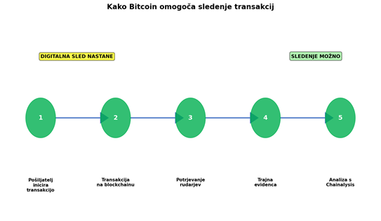 Vsaka Bitcoin transakcija je trajno zapisana na javni verigi blokov. Za razliko od gotovinske transakcije, ki se zgodi in ne pušča nobene sledi, Bitcoin ustvari digitalni odtis, ki ga ni mogoče izbrisati ali spremeniti. To pomeni, da je vsaka nezakonita transakcija trajno dokumentirana in jo je mogoče analizirati še leta kasneje.