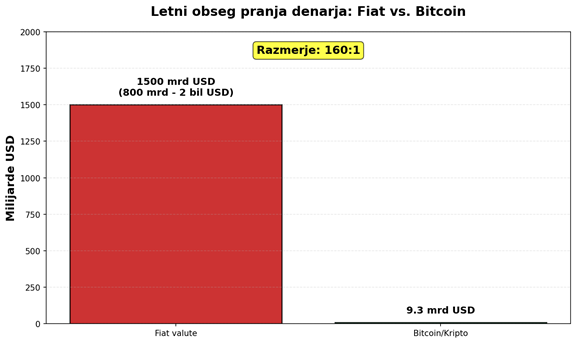 Šokantna razlika: Po podatkih UN Office on Drugs and Crime (UNODC) se letno opere 2-5% svetovnega BDP! V primerjavi s tem je obseg pranja denarja preko Bitcoina in drugih kriptovalut zgolj 8,6 do 10 milijard USD letno. To pomeni razmerje približno vsaj 100:1 v korist Bitcoina.